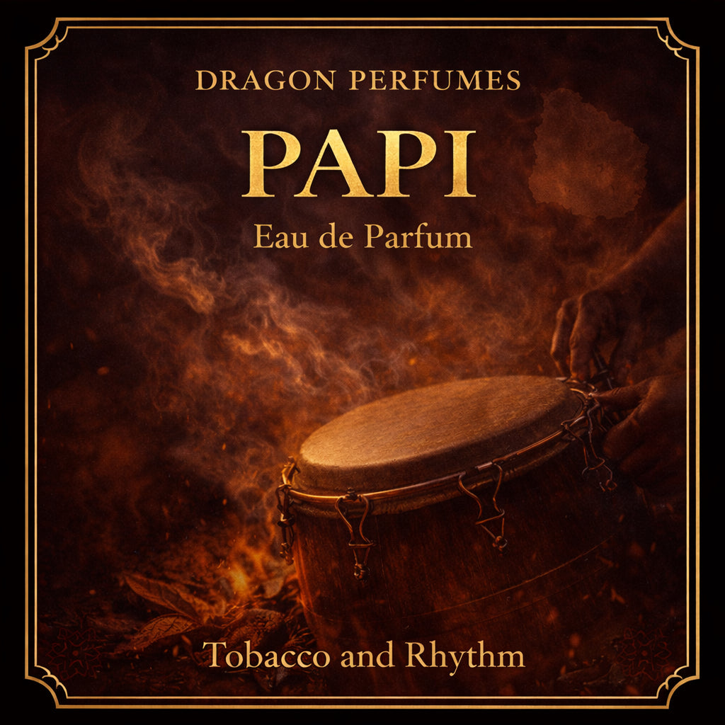 A deliberately simple structure built from aged materials and slow tinctures. PAPI is grounded in aged dark patchouli, ambergris musk, and a custom-made Virginia leaf tobacco tincture. Minimal florals soften the edges through Ylang Ylang, jasmine absolute, and magnolia. The opening is brief and restrained, shaped by a subtle fruit accord and a touch of clover. It develops quietly on skin, revealing depth through time rather than immediacy.